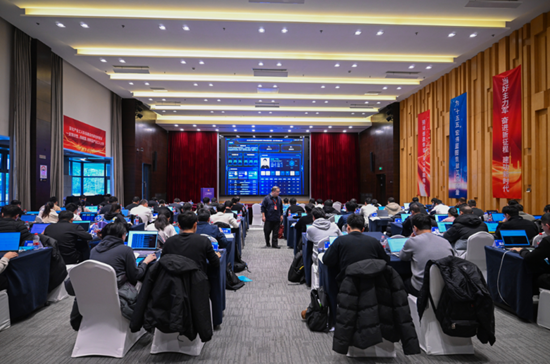 比赛现场,选手们全神贯注地答题。在宽敞明亮的竞赛场馆内,数十台电脑屏幕上闪烁着代码与图表,键盘敲击声此起彼伏。